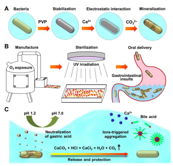 受礦化保護機制的啟發,我們描述了一種細胞相容的生物界面礦化方法,該方法可以在細菌表面產生超持久和自可移動的涂層來解決這些挑戰。礦物涂層使細菌對制造的相關氧暴露、紫外線照射和75%乙醇具有強大的抗性。口服后,該涂層能夠主動中和胃酸,并通過自發而快速的雙分解反應釋放被包裹的細菌。除了酸中和外,產生的鈣離子可以觸發膽汁酸的膠束聚集,使胃酸和膽汁酸的雙重豁免,以實現不受損害的細菌活力。