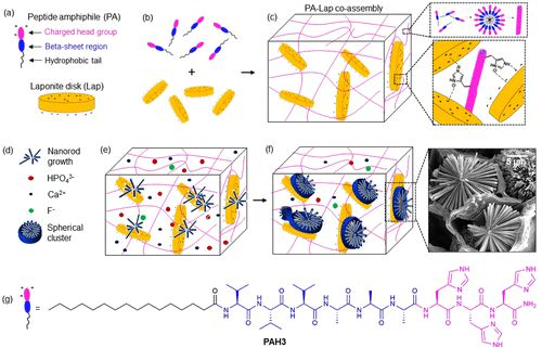 包含有機和無機成分的合成納米結構材料提供了一種獨特、強大且用途廣泛的材料類別,由于不同成分的固有特性具有獨特但互補的性質,基于合成納米粘土(Laponite,Lap)和肽兩親物(PAs,PAH3)構建了一個超分子系統,該系統經過合理設計,可以共同組裝成具有高結構完整性和一系列生物活性的納米結構水凝膠。利用光譜和散射技術以及分子動力學模擬方法來確認PAH3納米纖維靜電吸附并符合Lap的表面納米盤。電子和原子力顯微鏡也證實了與Lap共同組裝后PAH3納米纖維的直徑和表面積增加。動態振蕩流變學表明,共組裝的 PAH3-Lap水凝膠顯示出高剛度和穩健的自愈行為,而氣體吸附分析證實了分層和不均勻的孔隙率。此外,三維 (3D) 矩陣內的這種獨特結構為高縱橫比羥基磷灰石納米棒的成核和分層組織提供了空間限制,使其成為 3D 矩陣內明確定義的球形簇。有機-無機PAH3-Lap水凝膠的適用性在體外進行了評估使用人骨髓來源的基質細胞 (hBMSC) 和體外使用雞絨毛尿囊膜 (CAM) 測定。結果表明,有機-無機PAH3-Lap水凝膠促進人體骨骼細胞增殖,并在礦化后與 CAM 整合,被血管浸潤,刺激細胞外基質產生,并促進相對于對照的大量礦物質沉積。