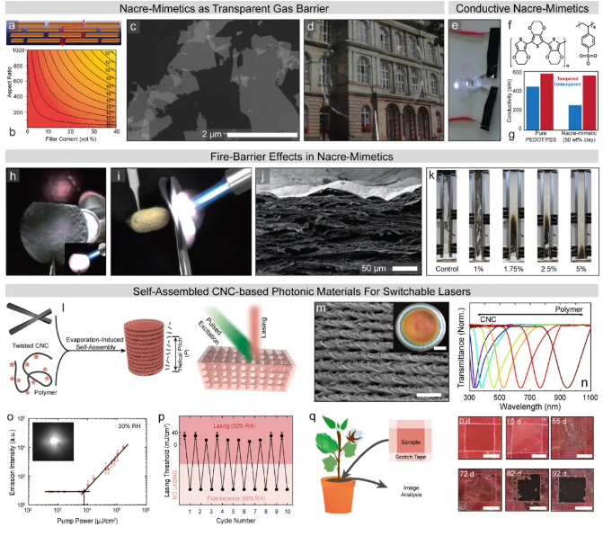 3) The author finally discussed how to obtain new functional properties based on the bio-inspired nanocomposite design strategy, especially flexible and transparent gas barrier materials or fireproof materials. In addition, a new type of self-assembled photonic material was demonstrated, which can even evolve into a self-assembled laser, thereby transferring the concept of mechanical nanocomposite material design to other functions.