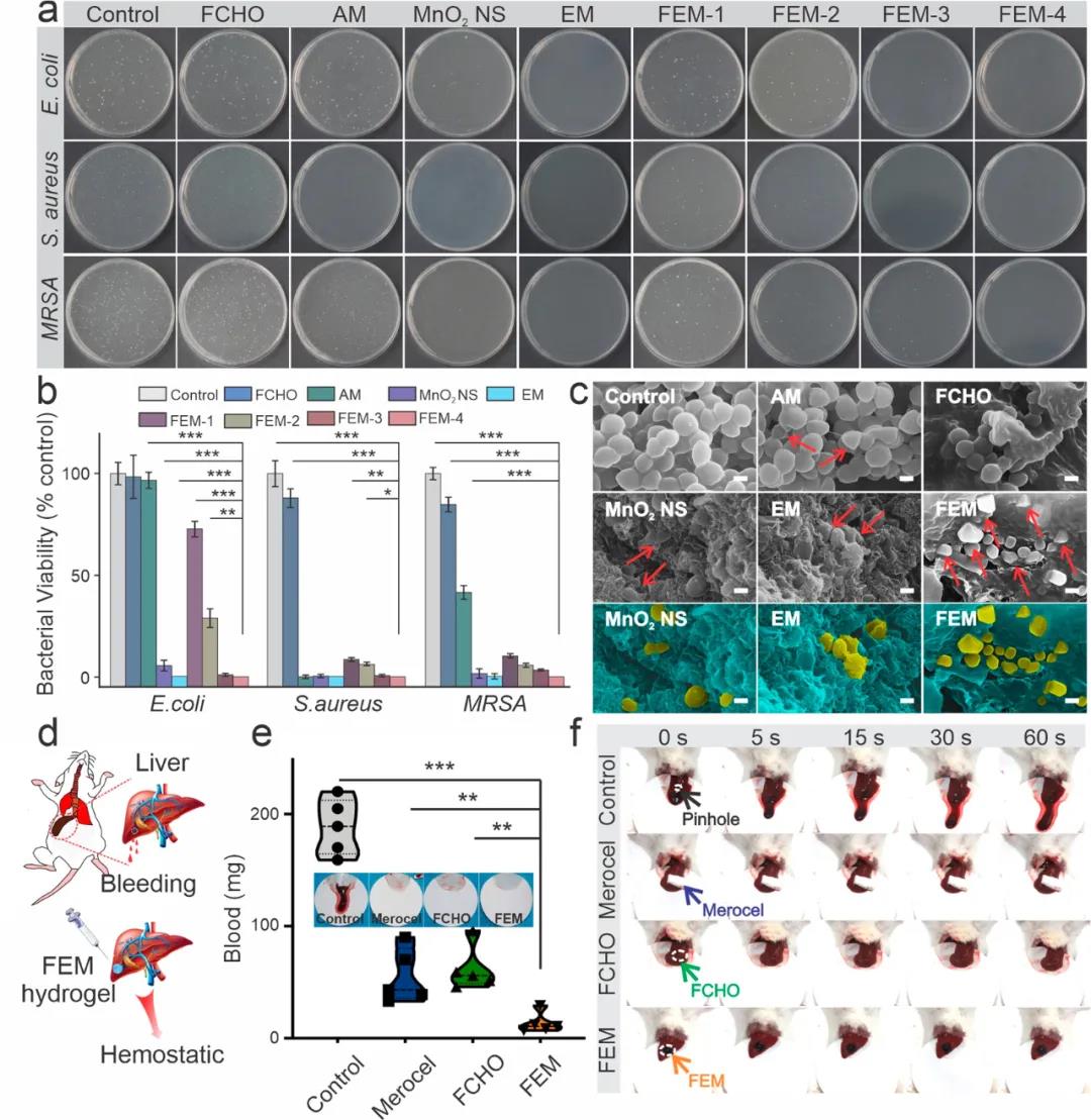Figure 4 Evaluation of antibacterial and hemostatic properties of FEM hydrogel