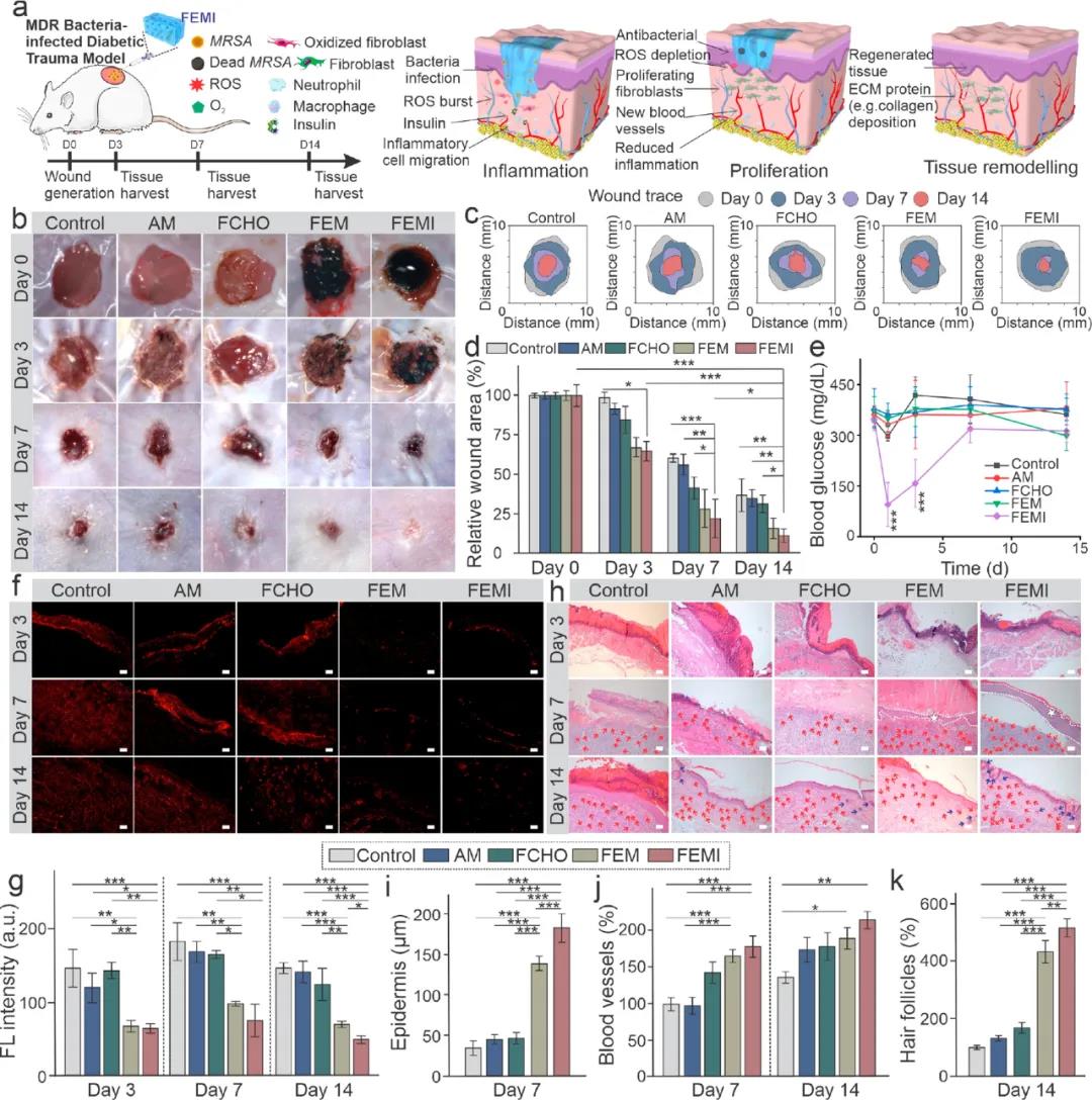 The study designed an anti-oxidant, anti-bacterial and hypoglycemic injectable hydrogel dressing, and verified that it can effectively promote the healing of bacterially infected diabetic wounds. The hydrogel dressing can also synergistically reduce inflammation, stimulate angiogenesis, accelerate cell proliferation, promote granulation tissue formation and ECM deposition, and show great potential in accelerating diabetic skin reconstruction in vivo.