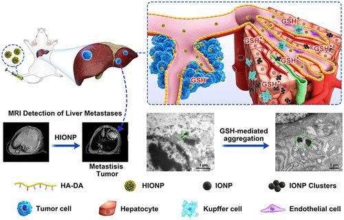 Liver metastases (LM) occur in a variety of cancers, and its early and accurate diagnosis is of great significance. However, due to the subtle differences between normal liver tissue and small metastases, the detection of small LMs is still a huge challenge. Here, Tang Jianbin of Zhejiang University and others used a one-pot method to prepare glutathione (GSH)-responsive hyaluronic acid-coated iron oxide nanoparticles (HIONPs) for high-sensitivity diagnosis of LMs.