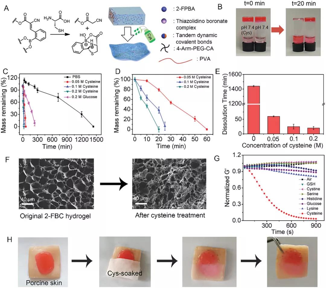 Figure 3. On-demand dissolution of 2-FBC hydrogel. A) Schematic diagram of 2-FBC hydrogel dissolution. B) Images of 2-FBC hydrogel before and after treatment with PBS (pH 7.4) or Cys solution (0.2 M, pH 7.4) for 20 minutes. C, D) Degradation of 2-FBC hydrogel in PBS (pH 7.4), PBS (pH 7.4) + 0.2 M glucose and PBS (pH 7.4) + cysteine. E) The dissolution time of 2-FBC hydrogel in PBS (pH 7.4) containing different concentrations of cysteine. F) SEM images of 2-FBC hydrogel before and after treatment with cysteine (0.2 m) for 10 minutes. G) Modulus changes of solutions (pH 7.4) exposed to biomolecules (glutathione, cystine, serine, histidine, glucose, lysine and cysteine). H) 2-FBC hydrogel adheres to pig skin tissue and is dissolved in cysteine soaked gauze as needed.