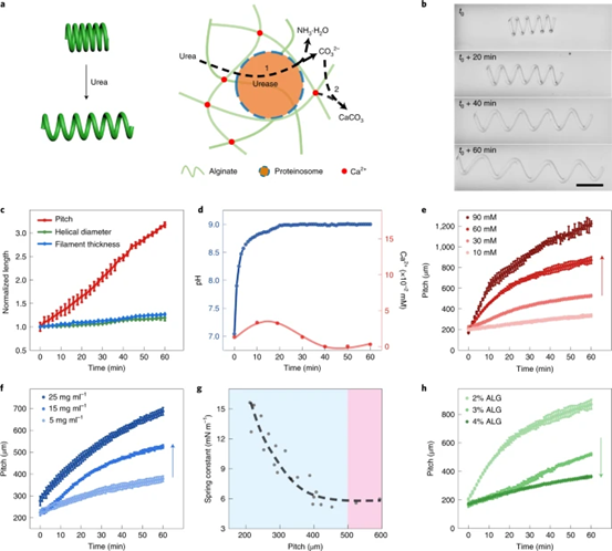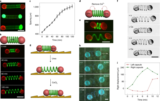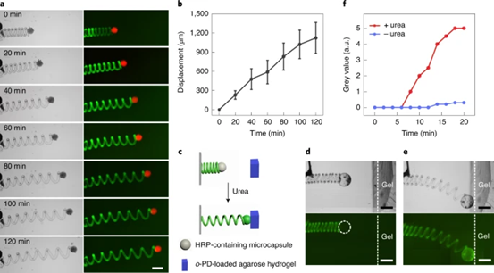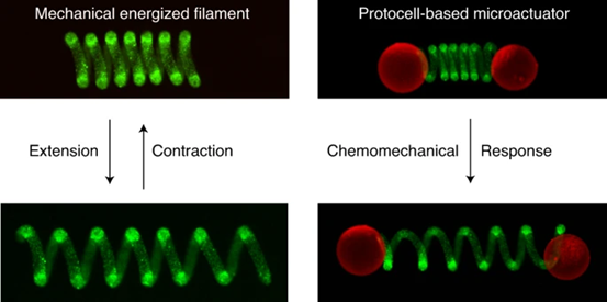 The team attached large single polynucleotide / peptide microcapsules at one or both ends of the helix like primitive cell filament to generate independent soft micro actuators that can sense and process chemical signals to perform mechanical work. Different translocation patterns are achieved through the synergistic or antagonistic enzyme reactions in the screw connector or the attached microcapsule load.