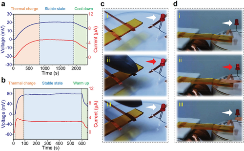 Figure 5 demonstration of the concept of lighting up LED in room temperature or cold environment using an organic hydrogel thermal battery. a) By collecting human body heat in the surrounding environment to continuously output voltage (blue line) and current (red line). b) Continuous output voltage (blue line) and current (red line) by collecting temperature gradient between ice surface and room temperature. C) organic hydrogel thermal batteries illuminate red LED photos by collecting body heat in the surrounding environment. D) by collecting the temperature gradient between the ice and room temperature, the organic hydrogel thermal battery illuminated the red LED photos.
