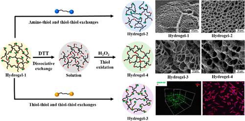 Schematic 2. schematic diagram of covalent adaptation of various hydrogels based on amine thiol / thiol mercaptan interference, uncoupling reaction and thiol two sulfides oxidation: (A) PEG two amine induced chemical bond disconnection and reconnection in H-, 1 matrix exchange through amine thiol and thiol thiol to generate H-2. (B) The chemical bond breaking and reconnection in H-1 matrix induced by PEG dithiol can obtain H-3 through mercaptan mercaptan exchange, and (c) DTT induced chemical bond breaking and hydrogen peroxide induced reconnection can produce H-4