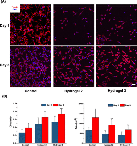Figure 2. Two dimensional cell culture using H-2 and H-3( A) Confocal microscope images showed the morphology of SH-SY5Y cultured on the surface of H-2, H-3 and confocal disk( B) the diffusion area and circularity of SH-SY5Y cells calculated by ImageJ software showed the different diffusion of cells on different gel surfaces.