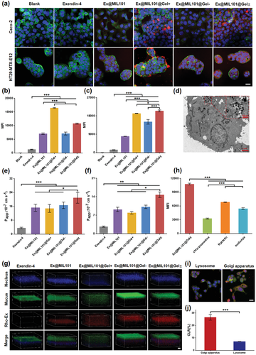 Fig. 2a) Caco-2 and E12 cells and free exendin-4 Ex@MIL101 、 Ex@MIL101 @Gel+、 Ex@MIL101 @Gel − and Ex@MIL101 @CLSM images after 2 hours of gel ± incubation. The mean fluorescence intensity (MFI) measured by flow cytometry in B) Caco-2 cells and C) E12 cells were incubated with exendin-4 for 2 hours. d) Caco-2 cells and their relationship Ex@MIL101 @TEM images after gel ± incubation. e) The apparent permeability coefficient (Papp) of exendin-4 in different preparations of Caco-2 cells and F) E12 cells. g) CLSM 3D images showed the location of E-12 cell monolayer and exendin-4 in different formulations. h) In Caco-2 cells, there was no significant difference between Caco-2 cells and Caco-2 cells Ex@MIL101 @Flow cytometry was used to measure the effects of PBS (without inhibitor), chlorpromazine, nystatin and amiloride Ex@MIL101 @The inhibition of gel ± endocytosis was evaluated for 2 hours. i) Lysosome (green) and Golgi body (green) are associated with Ex@MIL101 @Gel ± (red) Co located CLSM image. j) Ex@MIL101 @The colocalization rate (CLR) of gel ± lysosome and Golgi body.