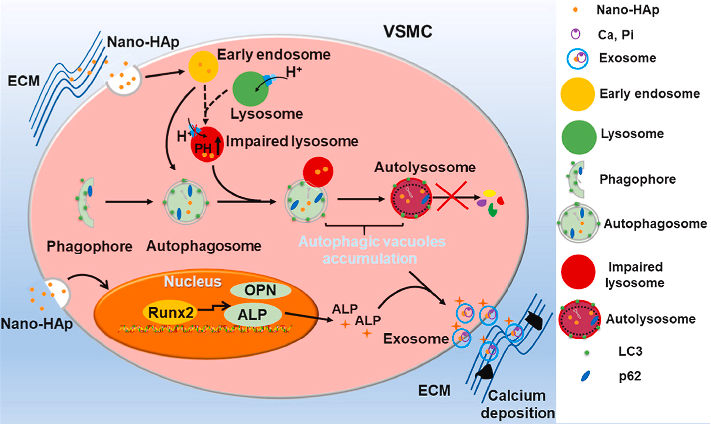 Vascular calcification (VC) is a common feature of aging, diabetes mellitus, chronic renal failure, and atherosclerosis. The basic component of the VC is hydroxyapatite (HAp). Nanometer-sized HAp (nHAp) has been identified to play an important role in the development of pathological calcification of the vasculature. However, whether nHAp can induce calcification in vivo and the mechanism of nHAp in VC progression remains unclear. We found that nHAp was present in vascular smooth muscle cells (VSMC) and their extracellular matrix (ECM) in the patient's calcified arteries. The synthetic nHAp has similar morphological and chemical properties to the native nHAp recovered from calcified arteries. The nHAp stimulates osteogenic differentiation and accelerates the mineralization of VSMC in vitro. Synthetic nHAp can also directly induce the VC in vivo. Mechanistically, ATPase is used for acidification, thus preventing the autophagic flow in VSMC. Lysosomal reacidification by cyclic 3 ′, 5 ′ -adenosine monophosphate (cAMP) significantly enhanced autophagic degradation and attenuated nHAp-induced calcification. Accumulated autophagosomes and autolysosomes are converted into calcium-containing exosomes, secreted into the ECM and accelerate vascular calcium deposition. Inhibition of exosome release in VSMC reduced calcium deposition. In summary, our results demonstrate an inhibitory effect of nHAp on lysosomal acidification, which suppresses autophagic degradation and promotes the conversion of accumulated autophagic vacuoles into exosomes, Pi and ALP loaded with unresolved nHApCa 2 +. These exosomes bud from the plasma membrane, deposit in the ECM, and form calcium nodules. Thus, nHAP accelerates vascular calcification by blocking autophagic flow in VSMC.