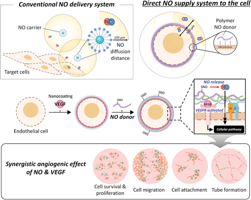 Nitric oxide (NO) is an intrinsic cell signaling molecule that is expected to be used in disease treatment, especially vascular disease, due to its inherent endothelium-derived properties. The limited diffusion distance of unstable NO has prompted researchers to develop various vectors and targeting methods for specific loci. In contrast to the apoptotic effects of NO (e. g., anticancer), the delivery of low concentrations of NO in the desired targeted region is still complex in a physiological context. In this study, layer-by-layer assembled nanocoatings were used to develop a platform for delivering NO delivery directly to single endothelial cells (EC). NO can be localized by S to a single EC-nitrosothiol-bound polyacrylic acid, a polymer that directly provides endothelial-like constant levels of NO. To work together with NO to increase angiogenic activation, VE GF was additionally applied to specific receptors on the cell surface. Notably, the synergistic effect of colocalization of NO and VE GF through the nanocoating significantly increased EC survival and proliferation. Moreover, the nanocoating significantly promoted cell migration and tubule formation — a prerequisite for angiogenesis. The proposed unique nanocoating-based technology demonstrates the great potential of conferring the desired angiogenic function to a single EC through efficient NO delivery.