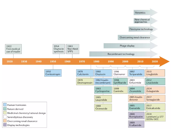 Since the 1960s, more than 80 peptide drugs have entered the clinic. In addition to insulin, ACTH, GLP-1, etc., natural products have become another important source of peptide drugs.